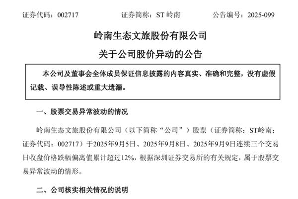 岭南生态文旅股份有限公司(简称:ST岭南)公告称,2025年9月5日、2025年9月8日、2025年9月9日连续三个交易日,公司收盘价格跌幅偏离值累计超过12%。根据深圳证券交易所的有关规定,属于股票交易异常波动的情形。 据新浪财经,9月8日,ST岭南触及跌停,跌停价1.61元,涨幅-4.76%,总市值29.12亿元,流通市值25....