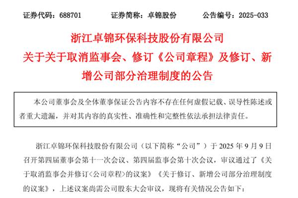 浙江卓锦环保科技股份有限公司(简称:卓锦股份)公告称,公司于2025年9月9日召开第四届董事会第十一次会议、第四届监事会第十次会议,审议通过了《关于取消监事会并修订的议案》《关于修订、新增公司部分治理制度的议案》。 一、取消监事会 根据《中华人民共和国公司法》《关于新配套制度规则实施相关过渡期安排》《上市公司章程指引》等法律、法规...