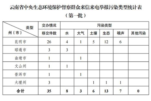 5月9日,中央第七生态环境保护督察组进驻云南,开展为期1个月的生态环境保护督察。 5月10日,中央第七生态环境保护督察组向云南移交第一批群众信访举报件35件,其中来电举报35件,来信举报0件。从信访举报件生态环境问题类型来看,涉及水8件、大气3件、噪声7件、土壤6件、生态13件(部分举报事件涉及多个问题类型)。从区域分布上看,昆明市...