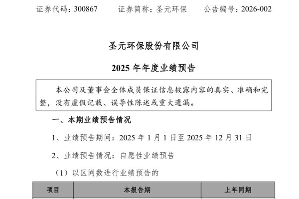 圣元环保股份有限公司(简称:圣元环保)近日发布《2025年年度业绩预告》。报告期内,圣元环保预计实现归属于上市公司股东的净利润为2.4亿元至2.9亿元,较上年同期增长31.79%至59.24%;预计2025年扣除非经常性损益后的净利润为2.45亿元至2.95亿元,较上年同期增长47.88%至78.06%。图源:圣元环保公告 报告期内...