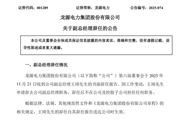 龙源电力集团股份有限公司(简称:龙源电力)公告称,公司近日收到了公司副总经理王琦先生的书面辞任报告。因工作变动,王琦先生申请辞去公司副总经理职务,辞任后不在公司及控股子公司担任任何职务。 王琦先生在任职期间,与公司及董事会无任何意见分歧,亦不存在任何与其辞任有关的其他需要通知证券交易所和公司股东注意之事项。截至本公告日,王琦先生未持...