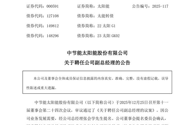 中节能太阳能股份有限公司(简称:太阳能)公告称,公司于2025年12月25日召开第十一届董事会第二十四次会议,审议通过了《关于聘任公司副总经理的议案》。因公司业务发展需要,经公司总经理张会学先生提名、公司董事会提名委员会确认,同意聘任公司总经理助理杜虎先生担任公司副总经理(杜虎先生原总经理助理职务自然免除),任期与公司第十一届董事会相...