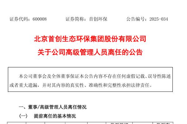 北京首创生态环保集团股份有限公司(简称:首创环保)公告称,9月29日,因高管团队调整,公司副总经理邢俊义离任,不继续在公司及控股子公司任职,原定任期到期为日2027年2月25日。图源:首创环保公告 首创环保表示,根据公司经营管理需要,对高级管理人员进行调整并已对相关工作做出妥善安排,邢俊义先生的离任不会影响公司的正常生产经营。截至本...
