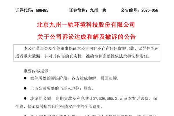 北京九州一轨环境科技股份有限公司(简称:九州一轨)公告称,公司于近日收到北京市房山区人民法院出具的《北京市房山区人民法院民事裁定书》【案号:(2025)京0111民初27540号】,基于长期友好合作基础,公司与中铁三局集团有限公司就前述案件达成和解,签署《付款协议》,法院准予撤诉。 涉案的金额:到期货款及利息共计27,536,595...