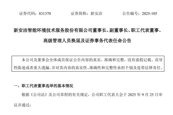 新安洁智能环境技术服务股份有限公司(简称:新安洁)近日公告称,公司董事长、副董事长、高级管理人员已完成换届: 选举魏延田先生为公司董事长,任职期限三年,自2025年9月25日起生效。该人员持有公司股份270,000股,占公司股本的0.089915%,不是失信联合惩戒对象。 选举王光强先生为公司副董事长,任职期限三年,自2025年9...