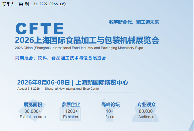 CFTE2026上海国际食品加工与包装机械展览会 2026 China (Shanghai)International Food Industry and Packaging Machinery Expo 同期展会:饮料、食品加工技术与设备展览会 2026年8月06-08日 |上海新国际博览中心 承办单位 北京江恒博威国际展览有限公司江恒...