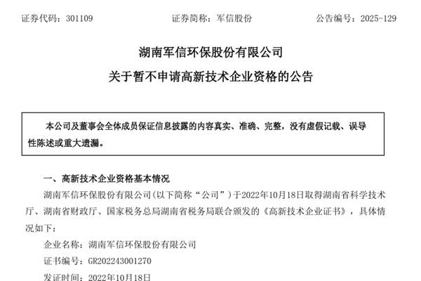 湖南军信环保股份有限公司(简称:军信股份)近日公告称,根据《高新技术企业认定管理办法》(国科发火〔2016〕32 号)第十一条高新技术企业认定条件之第六款规定:“近一年高新技术产品(服务)收入占企业同期总收入的比例不低于60%”。结合公司实际情况,公司近一年高新技术产品(服务)收入占企业同期总收入的比例不满足上...