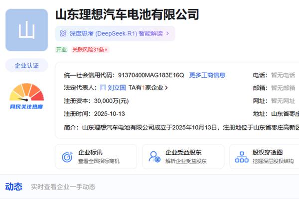 10月13日,山东理想汽车电池有限公司(下称“理想电池”)正式成立,法定代表人刘立国,注册资本3亿元人民币,所属行业为汽车制造业,经营范围包含电池制造;电池销售;新兴能源技术研发;电动汽车充电基础设施运营;输配电及控制设备制造;智能输配电及控制设备销售;集中式快速充电站;新材料技术研发等。图源:爱企查 股东信...