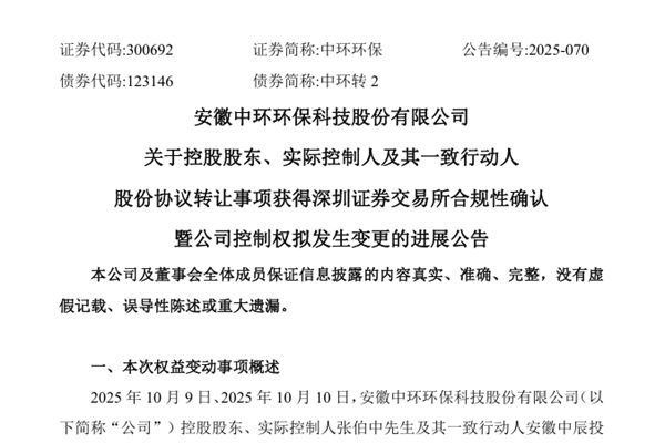安徽中环环保科技股份有限公司(简称:中环环保)公告称,公司于2025年11月3日收到张伯中先生及中辰投资的通知,经审核,深圳证券交易所已对本次协议转让股权事项予以确认。确认书有效期为六个月,转让双方需按照确认书载明的转受让股份数量一次性办理过户登记。 据悉,10月9日、10月10日,中环环保控股股东、实际控制人张伯中先生及其一致行动...