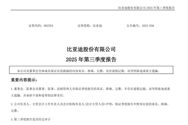 比亚迪股份有限公司(简称:比亚迪)近日发布《2025年第三季度报告》。2025年前三季度,比亚迪实现营收为5662.66亿元,同比增长12.75%;净利润为233.33亿元,同比下降7.55%。图源:比亚迪公告 销量方面,比亚迪前三季度累计销量3260146辆,同比增长18.6%,蝉联全国车企销冠。此外,比亚迪今年也加大了海外市场布...