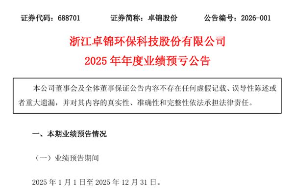 浙江卓锦环保科技股份有限公司(简称:卓锦股份)近日发布《2025年年度业绩预亏公告》。报告期内,经财务部门初步测算,卓锦股份预计2025年年度实现归属于母公司所有者的净利润将出现亏损,实现归属于母公司所有者的净利润为-5,500.00万元;归属于母公司所有者扣除非经常性损益后的净利润为-6,400.00万元。 卓锦股份表示,公司本期...