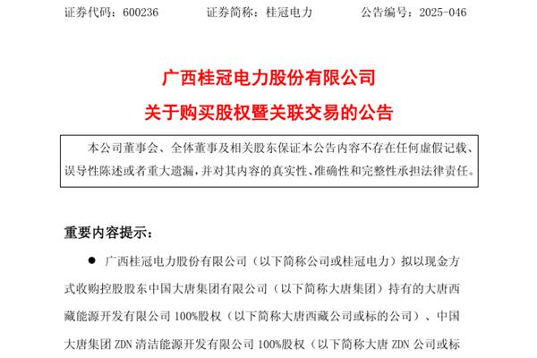 广西桂冠电力股份有限公司(简称:桂冠电力)近日公告称,公司拟以现金方式收购控股股东中国大唐集团有限公司(下称“大唐集团”)持有的大唐西藏能源开发有限公司100%股权(下称“大唐西藏公司”)、中国大唐集团ZDN清洁能源开发有限公司100%股权(下称“大唐ZDN公司”...