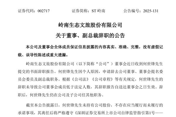 岭南生态文旅股份有限公司(简称:ST岭南)公告称,公司董事会近日收到何世锋先生提交的书面辞职报告。何世锋先生因个人原因,申请辞去公司董事、董事会提名委员会委员及副总裁职务。辞职后,何世锋先生仍在公司及子公司任其他职务。 截至本公告披露日,何世锋先生未持有ST岭南股份,不存在应当履行而未履行的承诺事项,其离任后将严格遵守《深圳证券交易...