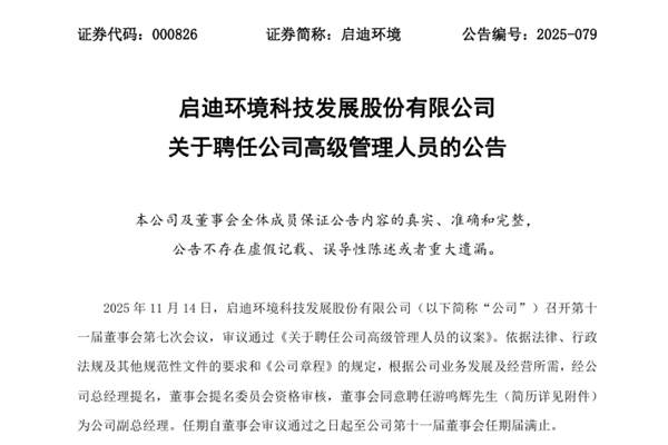启迪环境科技发展股份有限公司(简称:启迪环境)近日公告称,根据公司业务发展及经营所需,经公司总经理提名,董事会提名委员会资格审核,董事会同意聘任游鸣辉先生为公司副总经理。任期自董事会审议通过之日起至公司第十一届董事会任期届满止。 游鸣辉先生,男,1983年出生,中国农业大学本科,华南理工大学MBA,高级人力资源管理师。2005年5月...