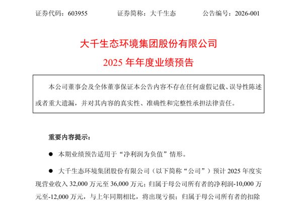 大千生态环境集团股份有限公司(简称:大千生态)近日发布《2025年年度业绩预告》,报告期内,大千生态预计实现营业收入32,000万元至36,000万元;归属于母公司所有者的净利润-10,000万元至-12,000 万元,与上年同期相比,将出现亏损;归属于母公司所有者的扣除非经常性损益后的净利润-10,500万元至-12,500万元。 ...