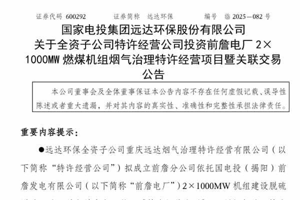 国家电投集团远达环保股份有限公司(简称:远达环保)近日公告称,为抢抓新一轮“大火电”机遇,坚持“BOT+EPC”协同推进,高质量开发火电环保特许经营项目,全资子公司重庆远达烟气治理特许经营有限公司(下称“特许经营公司”)拟成立前詹分公司依托国电投(揭阳)前詹发电有...