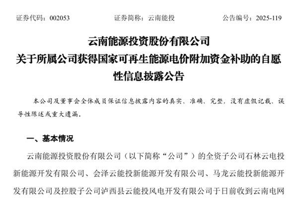 云南能源投资股份有限公司(简称:云南能投)公告称,日前,全资子公司石林云电投新能源开发有限公司、会泽云能投新能源开发有限公司、马龙云能投新能源开发有限公司及控股子公司泸西县云能投风电开发有限公司收到云南电网有限责任公司根据《财政部国家发展改革委国家能源局关于公布可再生能源电价附加资金补助目录(第一批至第七批)的通知》拨付的可再生能源电...