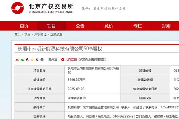 9月25日,中国三峡新能源(集团)股份有限公司在北京产权交易所挂牌转让长垣市云明新能源科技有限公司50%股权,转让底价5696.65万元。该公司由中国三峡新能源(集团)股份有限公司、北京清云能源集团有限公司各持股50%。 数据显示,长垣市云明新能源科技有限公司主营范围包括新能源科技领域内的技术开发、技术咨询、技术转让;风力发电项目、...