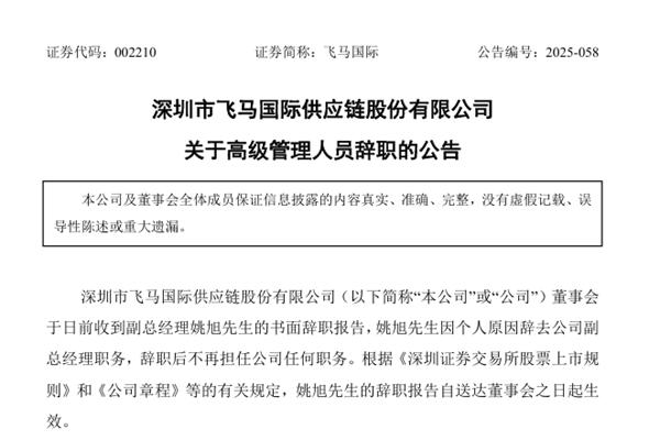 深圳市飞马国际供应链股份有限公司(简称:飞马国际)公告称,公司董事会于日前收到副总经理姚旭先生的书面辞职报告,姚旭先生因个人原因辞去公司副总经理职务,辞职后不再担任公司任何职务。 截至本公告日,姚旭先生未持有飞马国际股份,亦不存在应当履行而未履行的承诺事项。 公开资料显示,飞马国际实施“供应链服务+环保新能源&rdqu...
