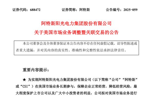 阿特斯阳光电力集团股份有限公司(简称:阿特斯)近日公告称,为实现公司在美国市场业务长期参与,保障企业正常经营,降低经营风险,最大程度保护上市公司以及广大中小投资者的利益,公司拟对美国市场业务进行调整: 公司与控股股东CanadianSolarInc(注册于加拿大的美股上市公司,下称“CSIQ”)新设合资公司M...