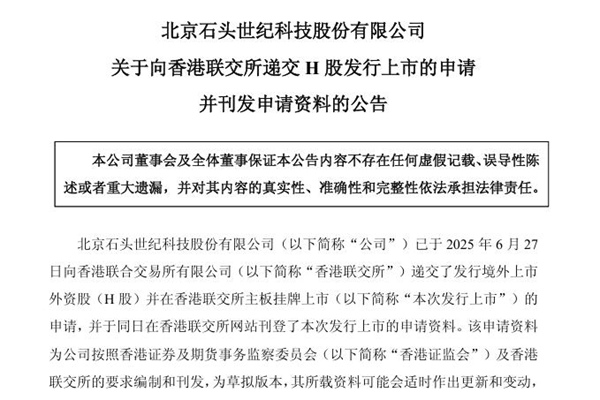 2025年06月28日,北京石头世纪科技股份有限公司发布《关于向香港联交所递交 H 股发行上市的申请并刊发申请资料的公告》。图源:石头科技公告 北京石头世纪科技股份有限公司已于 2025 年 6 月 27日向香港联合交易所有限公司递交了发行境外上市外资股(H 股)并在香港联交所主板挂牌上市的申请,并于同日在香港联交所网站刊登了本次发...