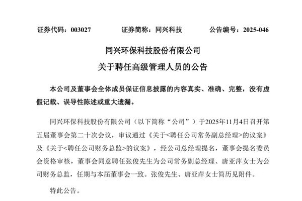 同兴环保科技股份有限公司(简称:同兴科技)公告称,公司于2025年11月4日召开第五届董事会第二十次会议,审议通过《关于的议案》及《关于的议案》,经公司总经理提名,董事会提名委员会资格审核,董事会同意聘任张俊先生为公司常务副总经理、唐亚萍女士为公司财务总监,任期与本届董事会一致。 张俊先生,男,1975年01月出生,中国国籍,无境外...