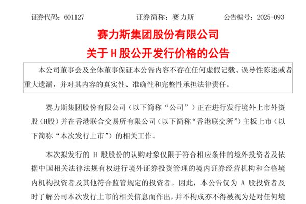 赛力斯集团股份有限公司(简称:赛力斯)11月3日公告称,公司已确定本次 H 股发行的最终价格为每股131.50港元(不包括1%经纪佣金、0.0027%香港证券及期货事务监察委员会交易征费、0.00565%香港联交所交易费及0.00015%香港会计及财务汇报局交易征费)。公司本次发行的 H 股预计于2025年11月5日在香港联交所主板挂...